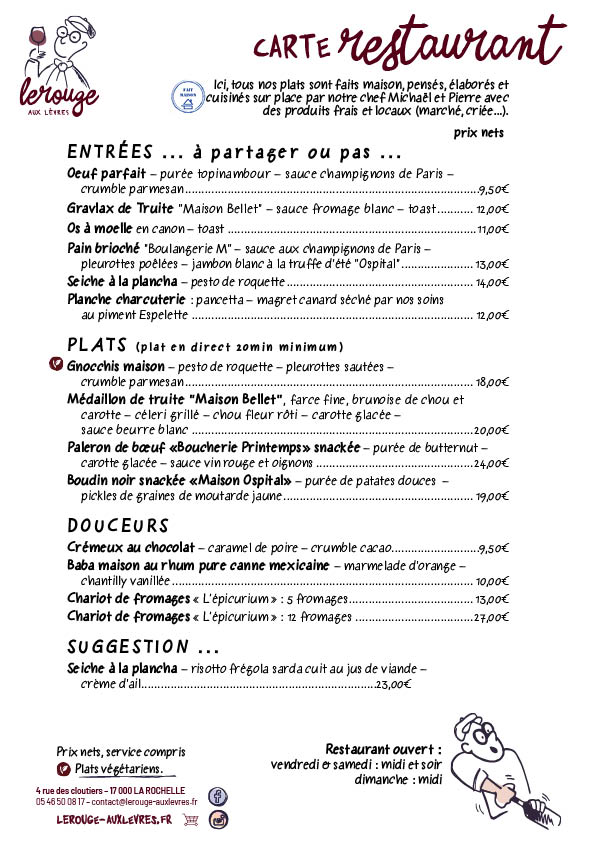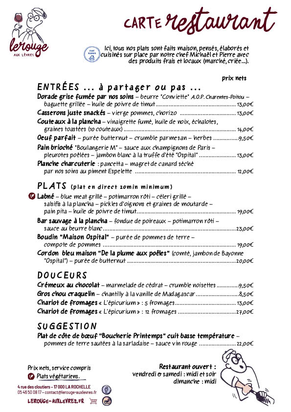 Fournisseurs: Boucherie Printemps (La Rochelle, 17) –Triperie Bouju (La Rochelle, 17) – De la plume aux poêles (La Rochelle, 17) – Charcuterie Montalet (Lacaune, 81) - Charcuterie Ospital (Hasparren, 64) – Maison Hurtaud (La Rochelle, 17) – La Cabane Océane huîtres (Île de Ré) - Marée Plus poissonnier (La Rochelle, 17) - L'Epicurium fromager (La Rochelle, 17) - Chèvrerie Saboureau (Exireuil, 79) – Les serres des Anglois bio fruits et légumes (Angoulins, 17) - Ferme de l'oeuf sur la paille oeufs (Saint Georges du bois, 17) Boulangerie M (La Rochelle, 17).